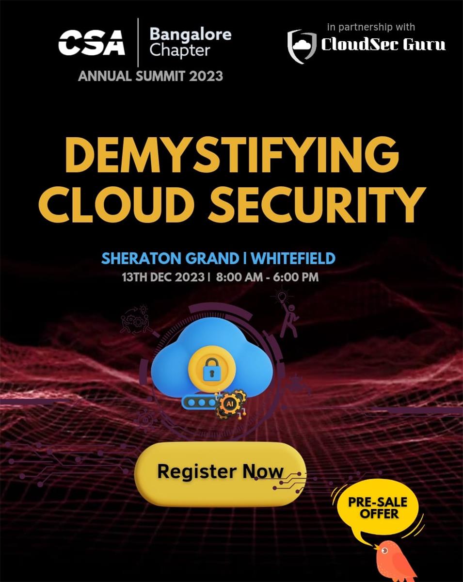 Cloud Security Alliance Bangalore Chapter in partnership with CloudSecGuru is thrilled to announce our upcoming annual event, "CSA Bangalore Annual Summit 2023-Demystifying Cloud Security" designed to provide valuable insights and knowledge about cloud security best practices, trends, and challenges. Mark your calendars and get ready to delve into the world of secure cloud computing!🌤️🔒