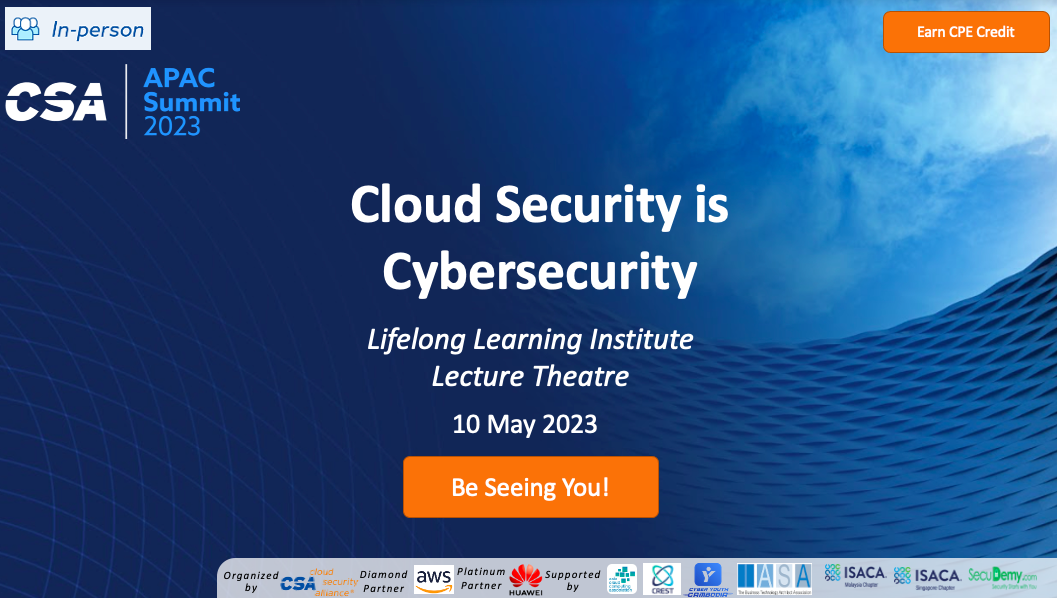 Organised by the Cloud Security Alliance (CSA), the summit will provide insights & perspectives of critical strategic cloud & cybersecurity concerns. Do join the leading experts with domain proficiency & expertise to discuss the key issues & trends facing cloud security & cybersecurity. The invited speakers include Veronica Tan (Director, Cyber Safe Programme, Cyber Security Agency, Singapore), WONG Onn Chee (Co-Chair, CSA Government Affairs Council & CSA Fellow), Dr. KANG Meng-Chow (Adjunct Associate Professor, Nanyang Technological University), Dr. Daisuke MASHIMA (Principal Research Scientist, Illinois at Singapore Pte Ltd), & Victor CHIN (Member, CSA Top Threats Working Group). Join us for an exciting day of learning & networking. The summit program can be found at https://www.csaapac.org/csaapacsummit2023.html under the Schedule tab, while the registration link under the Summary tab.