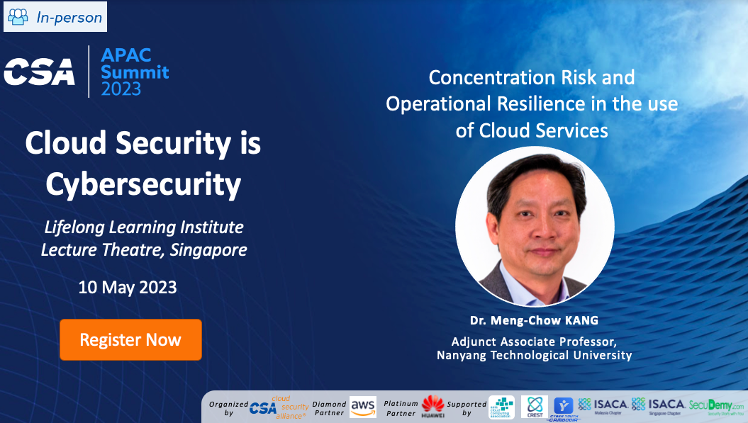 Dr. Meng-Chow KANG (Adjunct Associate Professor, Nanyang Technological University) will speak on "Concentration Risk and Operational Resilience in the use of Cloud Services." As organizations increase adoption of public cloud services, several regulators have expressed concerns over potential concentration risk that may affect organizations & the industry as a result of major service outages or cyber-attacks that cloud service providers (CSPs) may encounter. This session presents our findings on the perspectives of cloud users, CSPs, & global regulators on their concerns & considerations on concentration risk, the challenges of balancing business needs, & the measures that respective stakeholders may undertake to improve their operational resilience. The summit program can be found at https://www.csaapac.org/csaapacsummit2023.html under the Schedule tab, while the registration link under the Summary tab.
