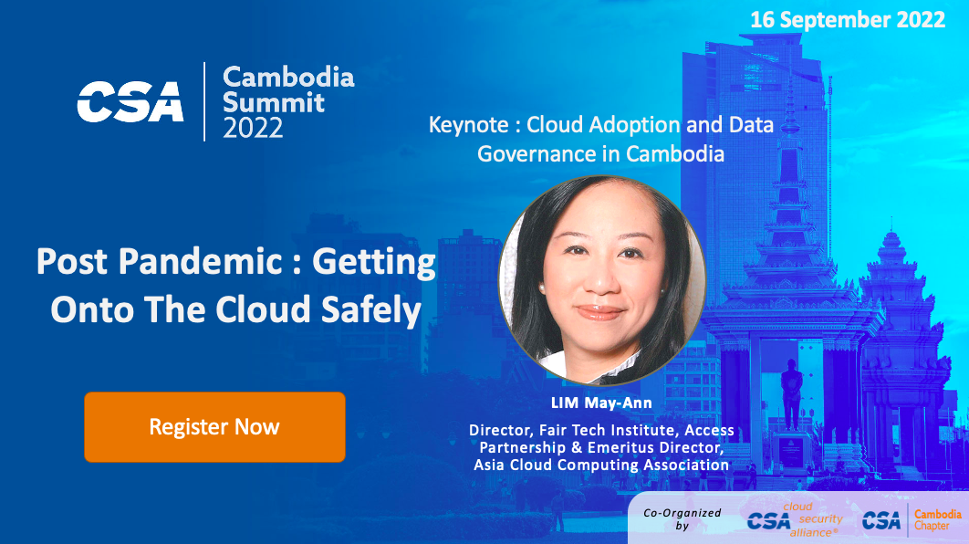 The keynote address on "Cloud Adoption and Data Governance in Cambodia" will be given by Ms. May-Ann LIM (Director, Fair Tech Institute, Access Partnership & Emeritus Director, Asia Cloud Computing Association). There is much interest & excitement about how Cambodia can be riding the wave of digitalization through cloud computing to power its economic development. This presentation will examine the level of cloud adoption in Cambodia, the types of services which are being consumed, & examine some cloud adoption & cybersecurity related issues & regulations which may help - or impede - Cambodia's digital transformation journey. The program & registration links are available at: https://www.csaapac.org/csacambodiavsummit2022.html.