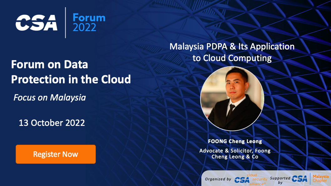 "Malaysia PDPA & Its Application to Cloud Computing" will be presented by FOONG Cheng Leong (Advocate & Solicitor, Foong Cheng Leong & Co). This presentation will cover the salient points of the Malaysian Personal Data Protection Laws in the context of cloud services, including application to the Cloud. The registration and program links can be found at: https://www.csaapac.org/csamyforum2022.html.