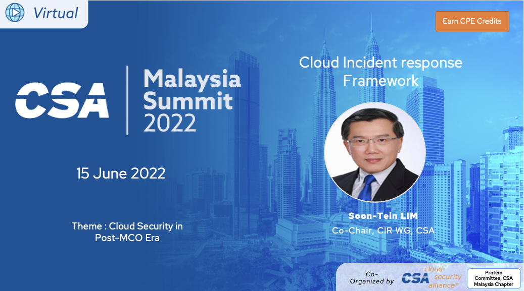 Soon-Tein LIM (Co-Chair, CIR Working Group, CSA) will present on "Cloud Incident Response Framework." In cloud incidents, it is necessary to coordinate and share information with stakeholders and other organizations which will be discussed. This presentation is for all cloud customers as well as cloud service providers who need a clear framework for sharing incident response practices with customers. The program and registration link can be found at https://www.csaapac.org/csamalaysiavsummit2022.html.