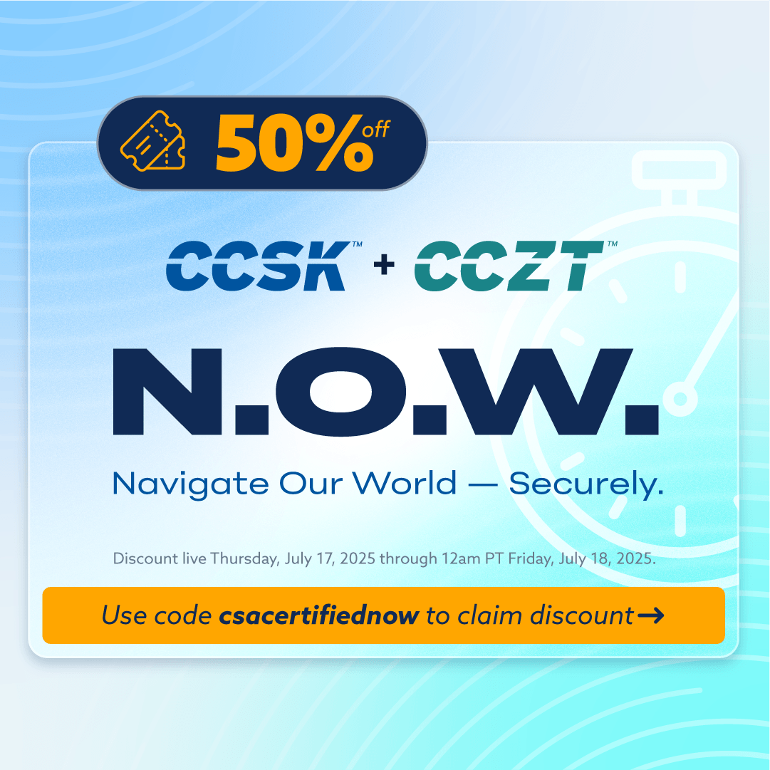 CSA’s Summer Flash Sale ends tonight at 12 AM — don’t miss your chance to get 50% off CCSK v5 and CCZT certification bundles.