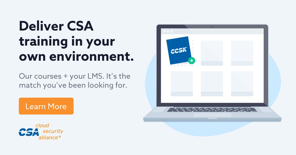 Through CSA’s Corporate Learning & Development Program, you can now deliver the online Certificate of Cloud Security Knowledge (CCSK) Foundation course in the comfort of your own Learning Management System (LMS).