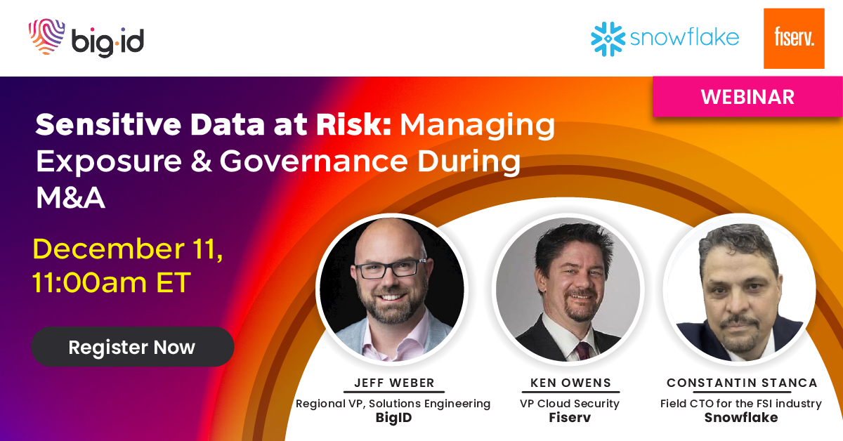 Experts from Fiserv, Snowflake, and BigID will break down how modern teams are discovering, classifying, and protecting data during major organizational changes - whether that's M&A, new platforms, modernization, or rapid growth.