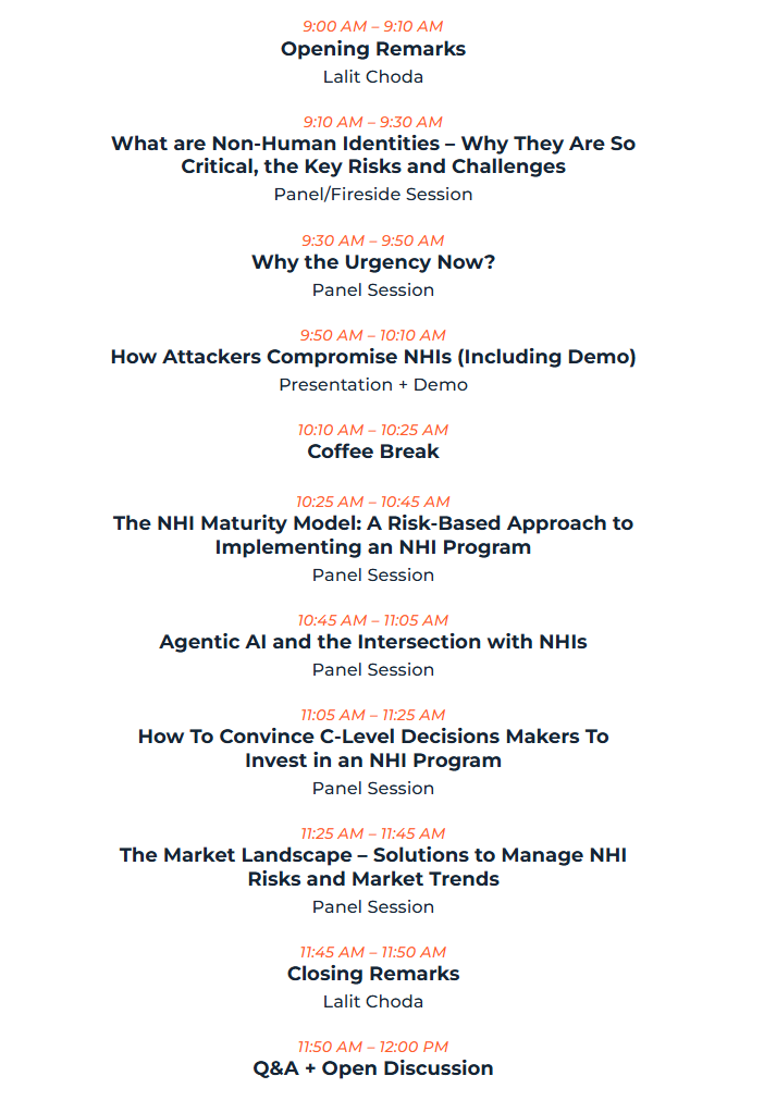 Lalit Choda (#MrNHI) will be hosting the event with CISOs, Senior Identity/Security practitioners from companies including Mars, Sprinklr, Ciena, Gap, Boomi, Cigna, as well as numerous thought leaders that are developing NHI Risk Management capabilities.