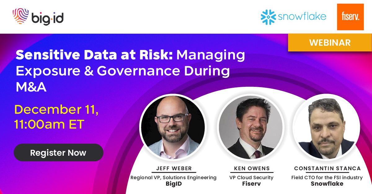 Leaders from Fiserv, Snowflake, and BigID will unpack how organizations keep control of their data during M&A, migrations, modernization, and fast growth — without slowing the business.