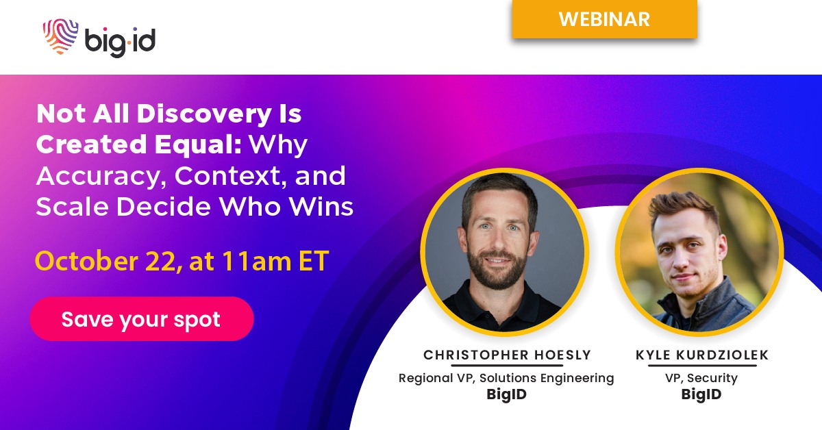 Join BigID’s Christopher Hoesly and Kyle Kurdziolek to see next-gen discovery in action,  powered by AI for accurate classification, full coverage across environments, deep context, and automated tracking.